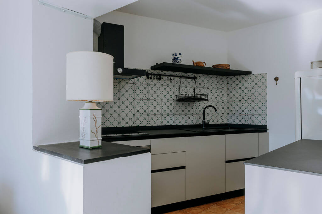 The new modern kitchen perfectly fits the original hand-painted wall tiles as well as the slate counter top and shelves.