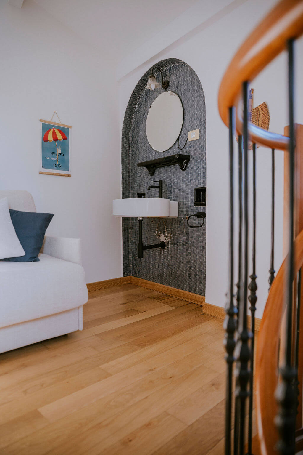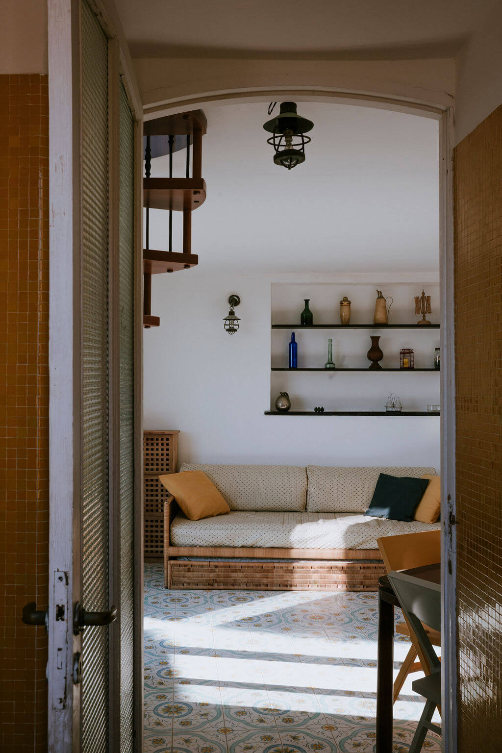 New movable curtains hide a stacking bed and two lateral closets. Their light-blue stripes match original mosaic tiles of the wall niche and some of the original pieces of furniture of the house.