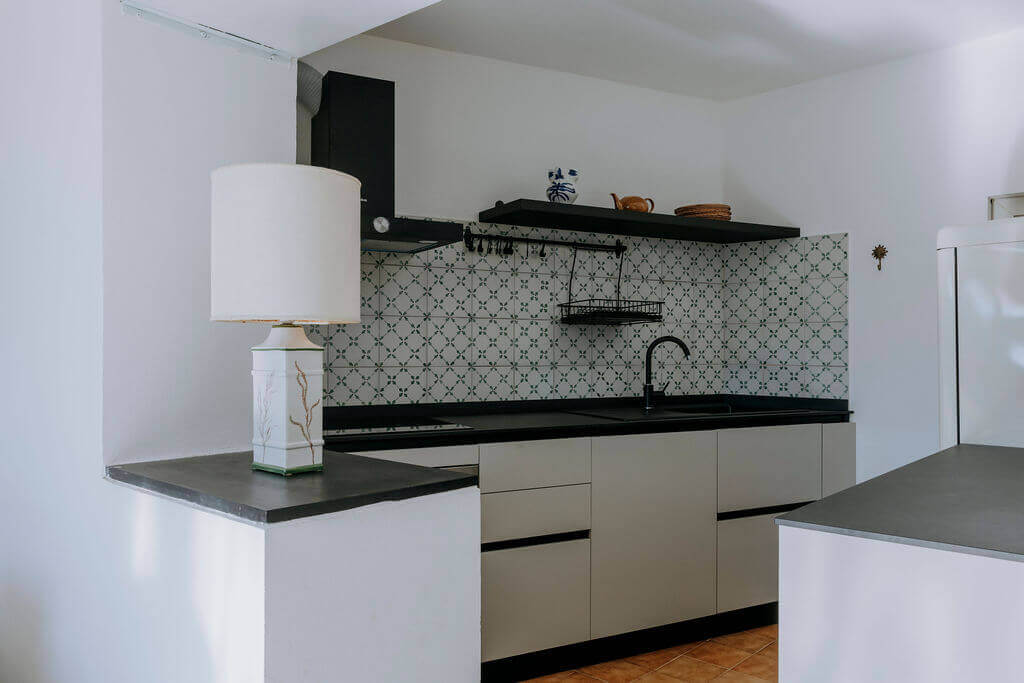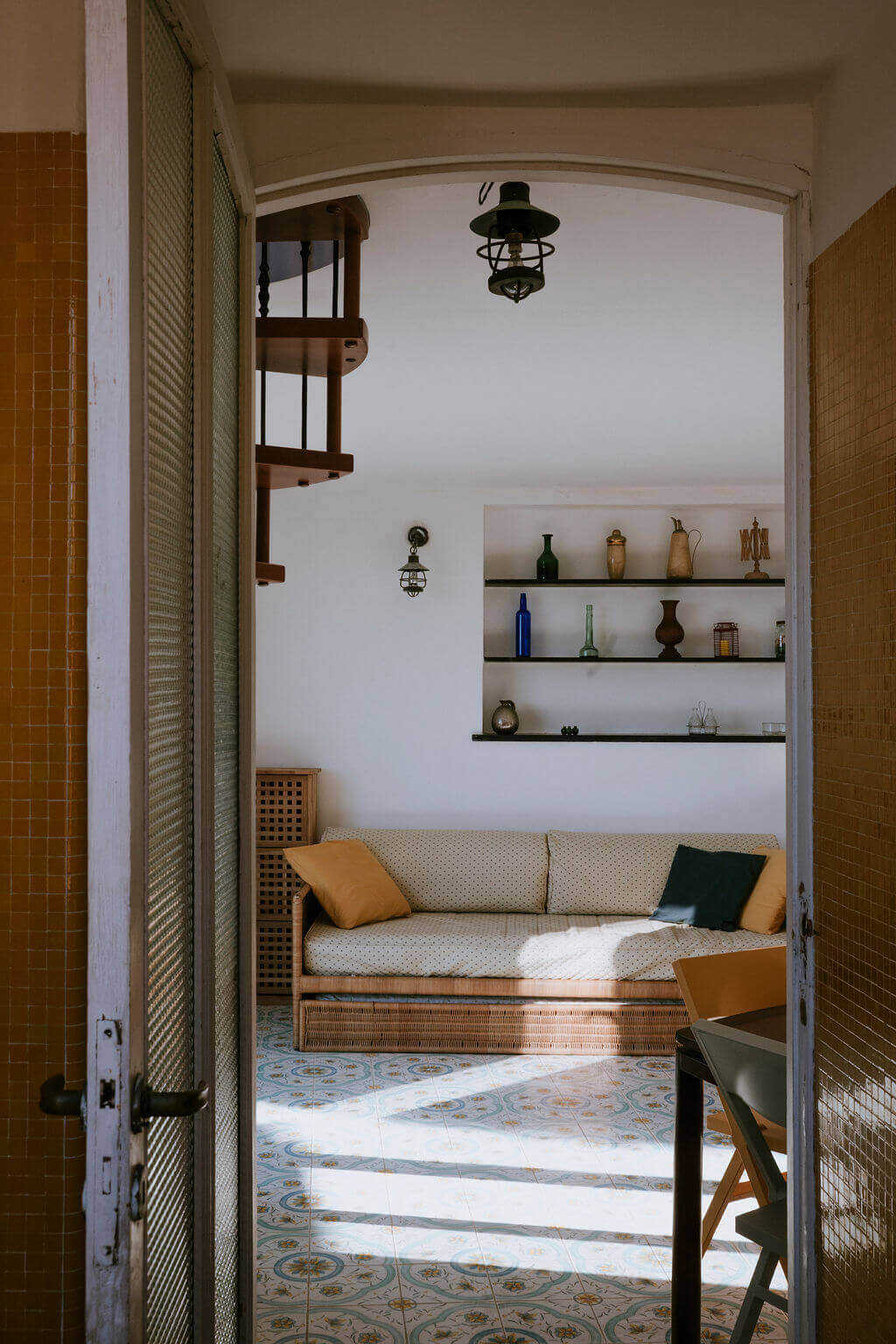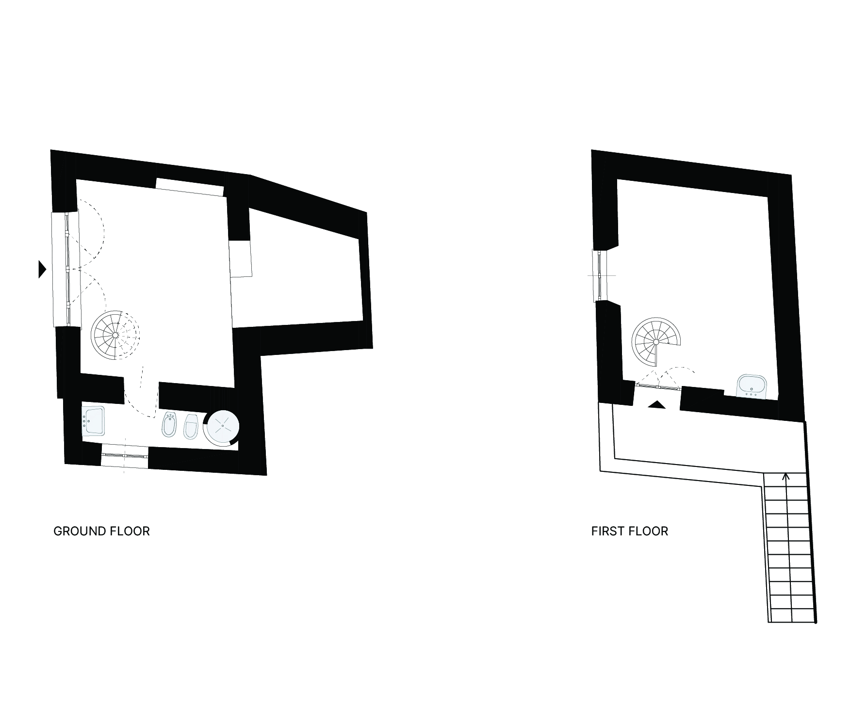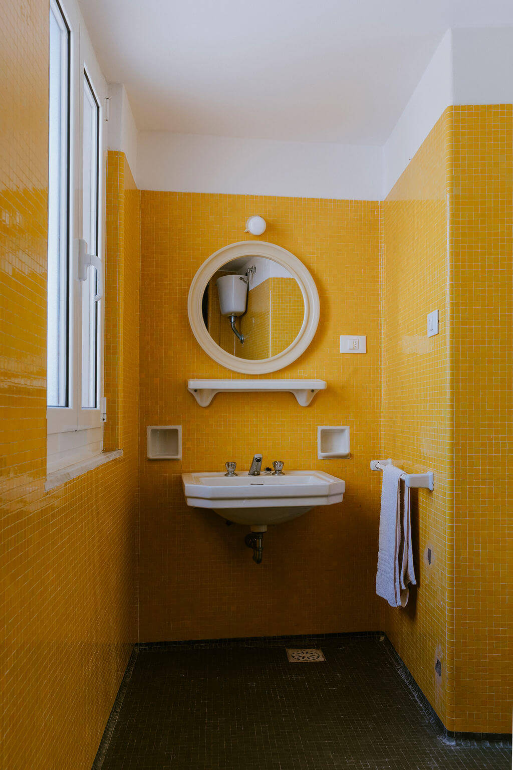 La zona notte al piano superiore può ospitare una coppia – aprendo il divano letto matrimoniale – o una famiglia numerosa, sfruttando i letti a castello nascosti dalle tende in stoffa rigata. Le nicchie ricavate ai lati del letto a castello fungono da armadiatura e da spazio tecnico. Un nuovo lavabo ha sostituito quello esistente, integrandosi con i mosaici a parete e i portasapone incassati in ceramica nera. In ogni dettaglio del progetto, elementi nuovi e originali convivono armoniosamente, raccontando la storia della casa con un approccio contemporaneo e funzionale.