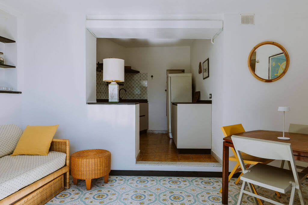 La zona giorno e la zona notte sono progettate come spazi virtualmente invertibili: entrambe dispongono di un divano letto matrimoniale, di un lavabo e di un accesso diretto al giardino della villa, garantendo flessibilità e continuità tra interno ed esterno.
