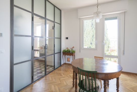 La parete di confine tra cucina e sala da pranzo è stata realizzata con una vetrata su misura, creando due ambienti distinti ma in comunicazione visiva, per un equilibrio tra separazione funzionale e apertura spaziale.