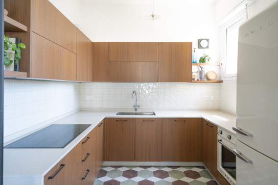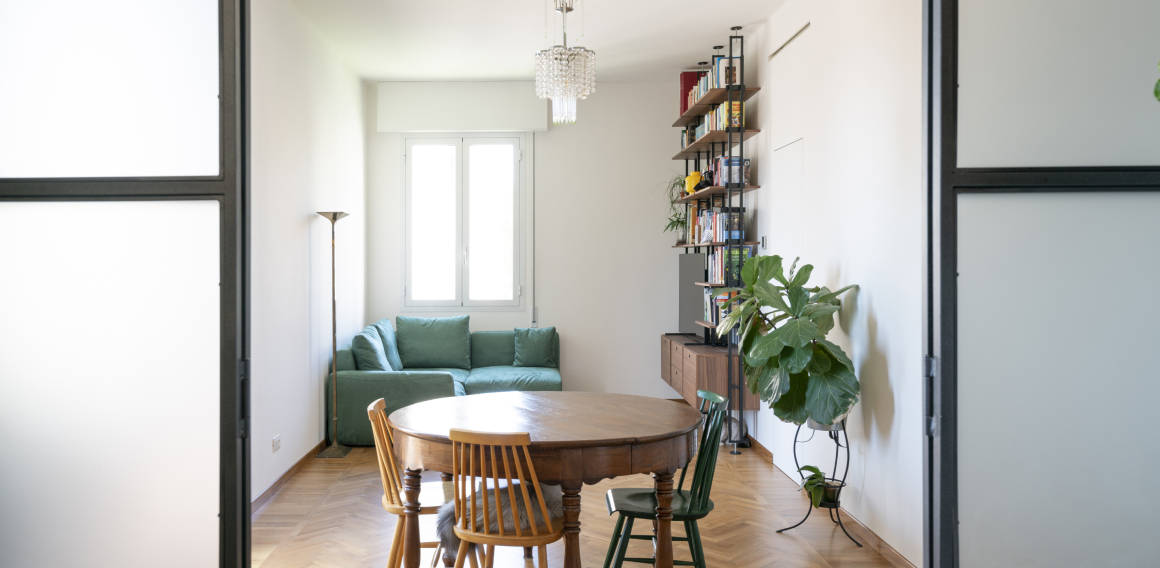 La rimozione di una semplice parete divisoria ha trasformato gli spazi, creando un’ampia zona giorno visivamente collegata alla cucina tramite una vetrata su misura.