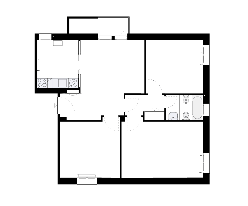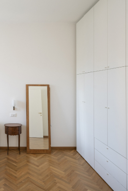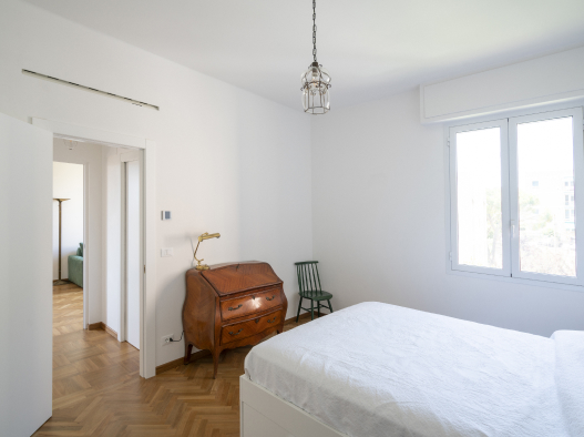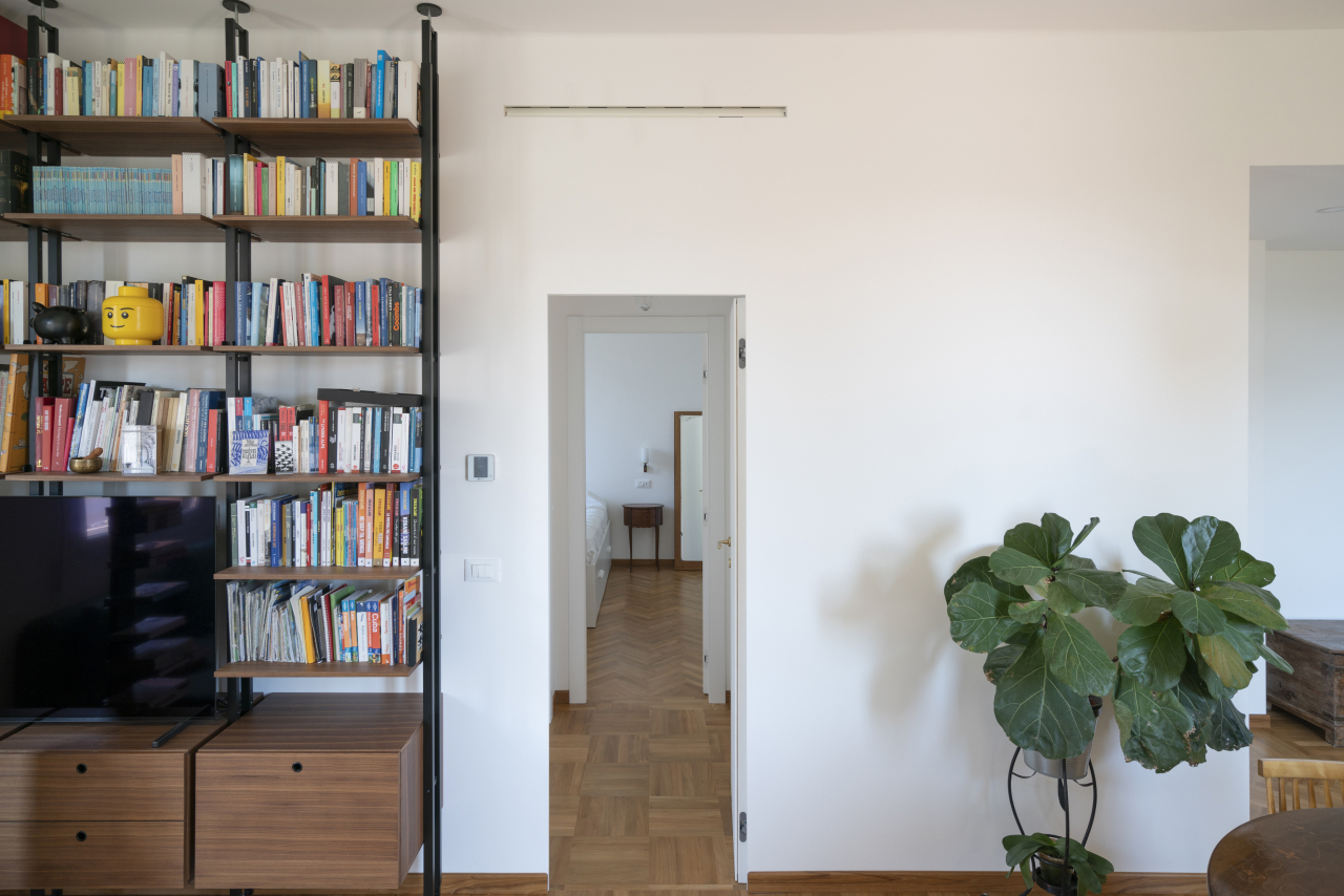 L’ottimizzazione dei percorsi interni ha permesso di ricavare un secondo bagno/lavanderia, mentre una porta a filo muro separa con eleganza la zona giorno dalla zona notte, integrandosi armoniosamente nella parete del soggiorno.