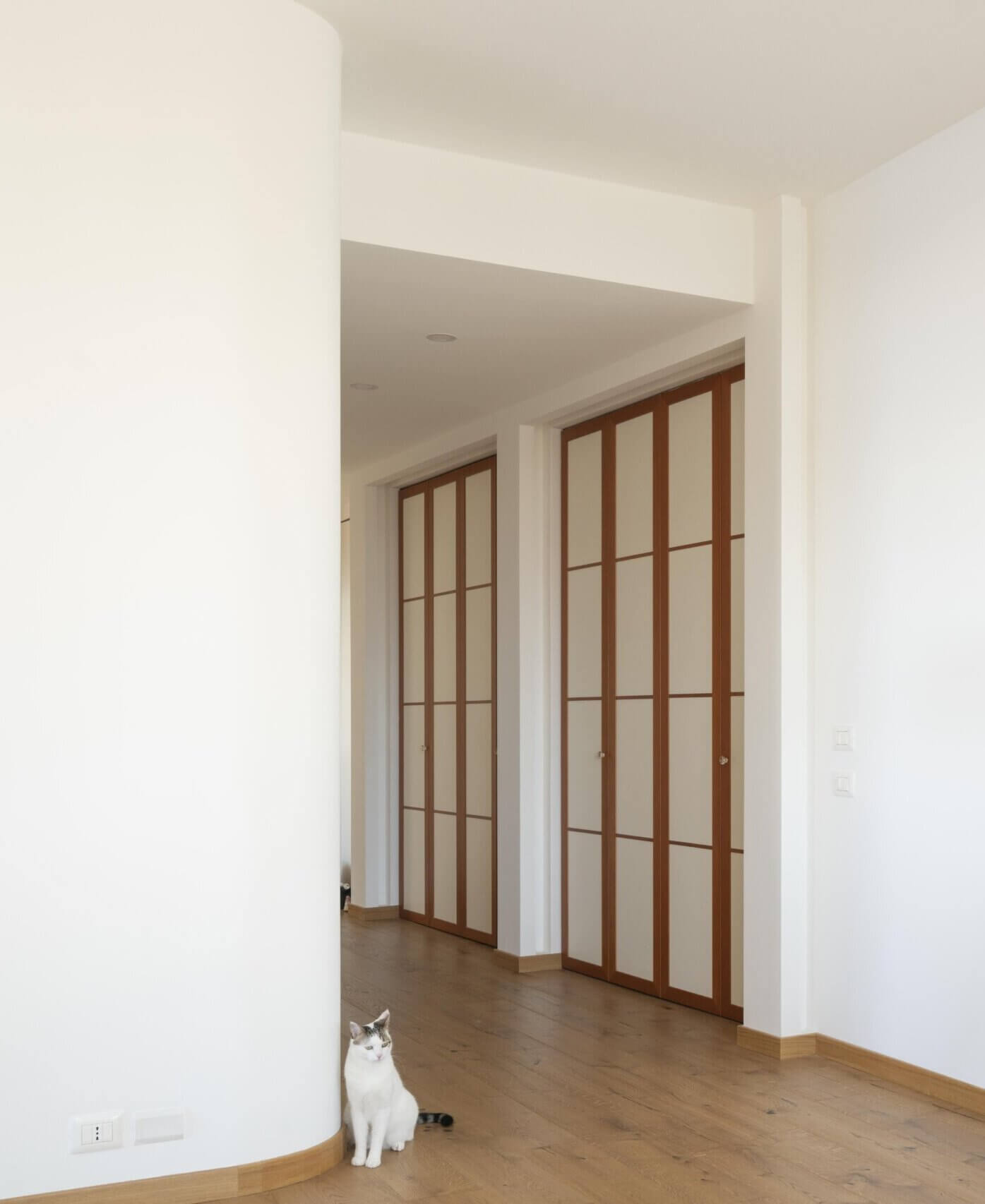 La pavimentazione originale in marmo è stata preservata sotto un nuovo parquet in rovere prefinito, posato flottante senza l’uso di colle. Questa soluzione consente un eventuale smontaggio e riutilizzo del pavimento in legno, mantenendo intatta la pavimentazione in marmo e permetendo il suo recupero futuro, unendo sostenibilità e flessibilità progettuale.