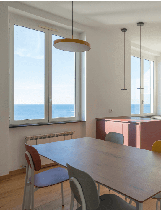 Un appartamento di città che evoca l’atmosfera delle vacanze estive: un ampio open space da cui si aprono molteplici prospettive sul mare, catturando luce e respiro in ogni angolo.
