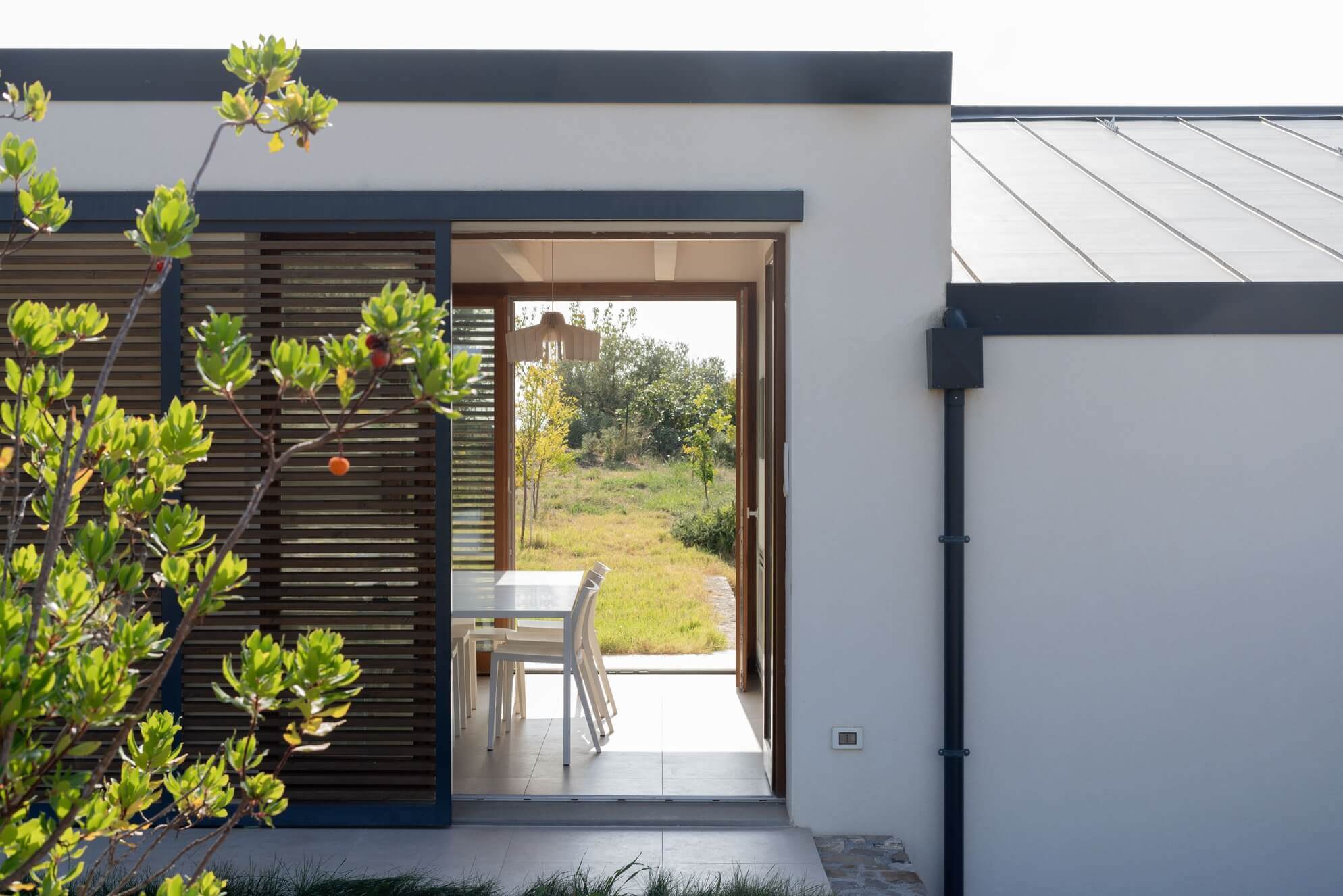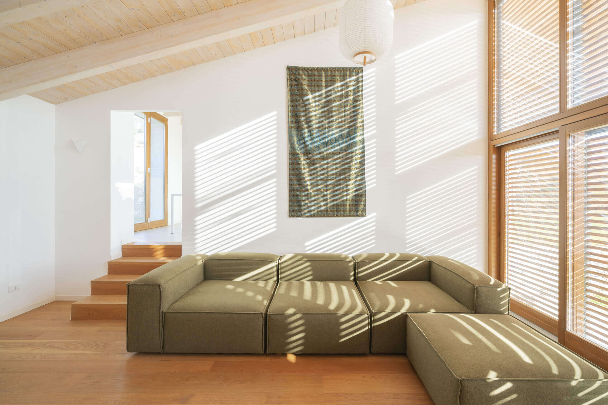 La qualità dell’ambiente interno è massimizzata grazie a un sistema di ventilazione naturale, ante frangisole scorrevoli per controllare l’irraggiamento solare e l’uso di materiali di finitura naturali, creando spazi salubri e confortevoli.